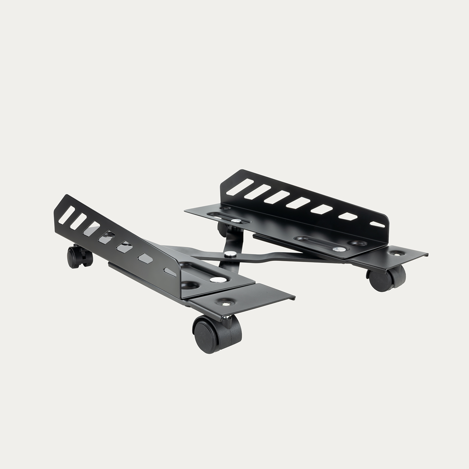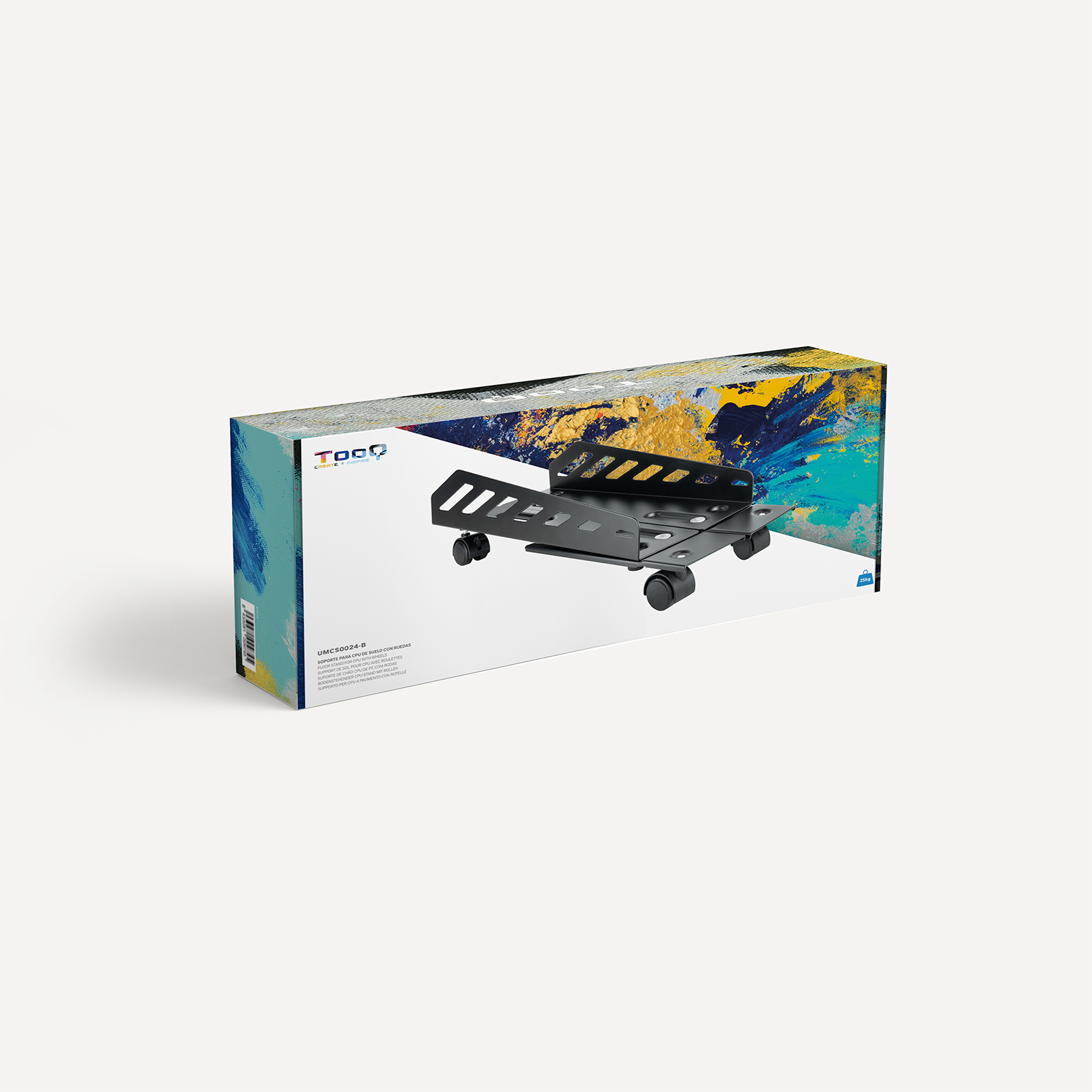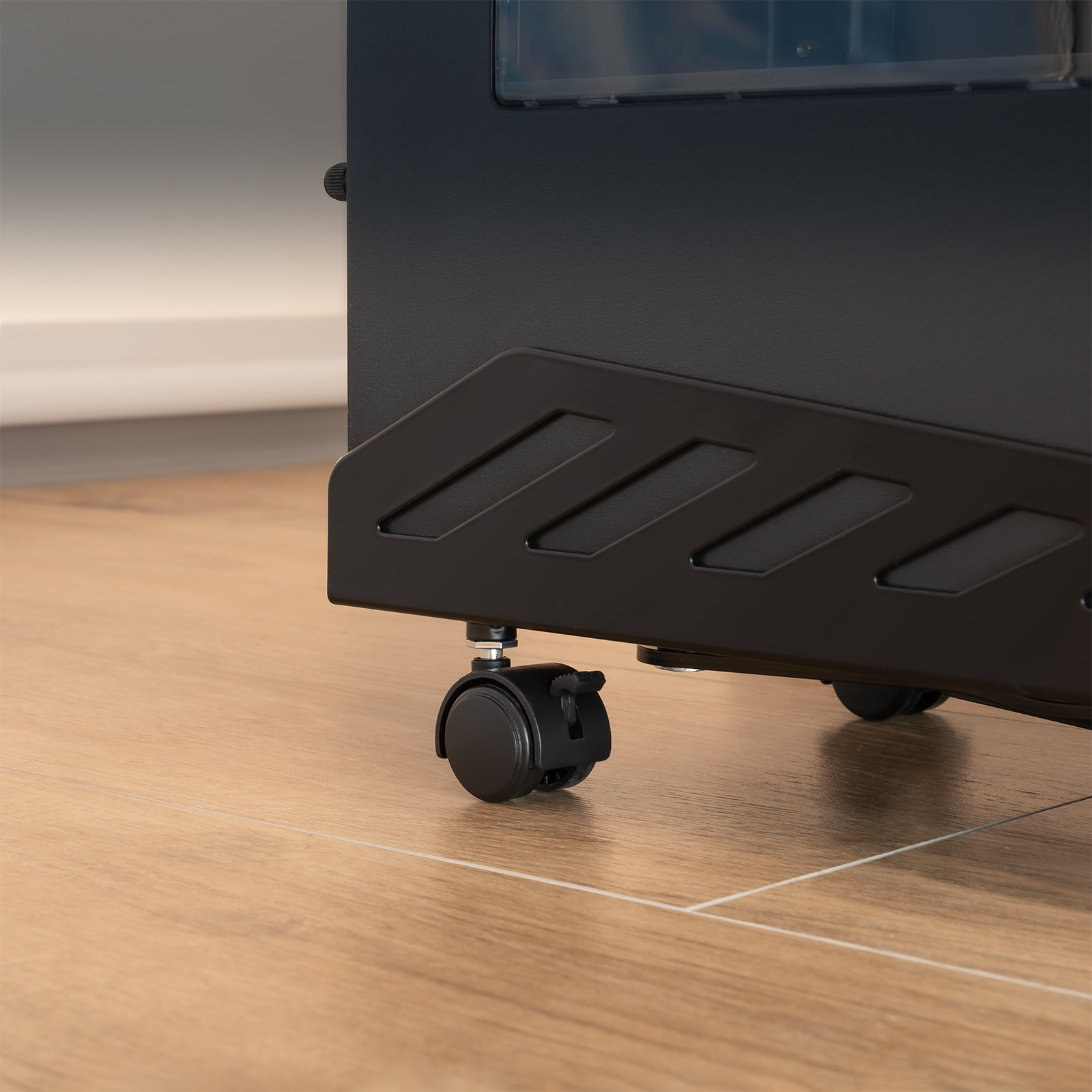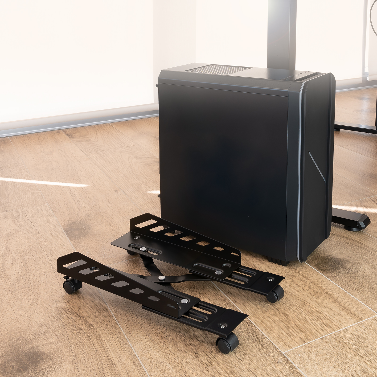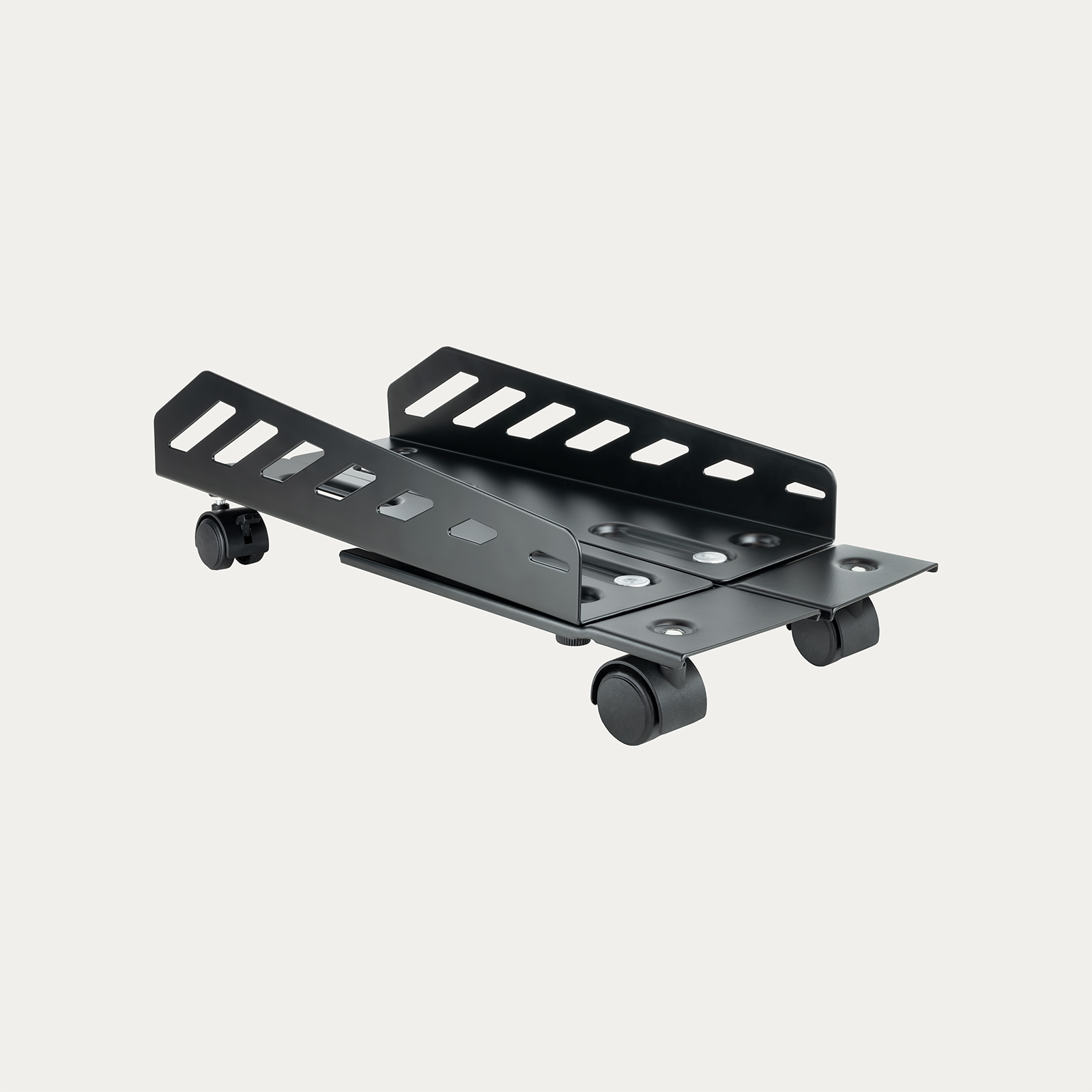 Soporte metálico de suelo para CPU con ruedas giratorias, diseñado para facilitar el desplazamiento y la colocación de la torre. Dispone de sistema de bloqueo en dos de sus ruedas para mayor estabilidad y seguridad, y está preparado para soportar equipos de hasta 25 kg.